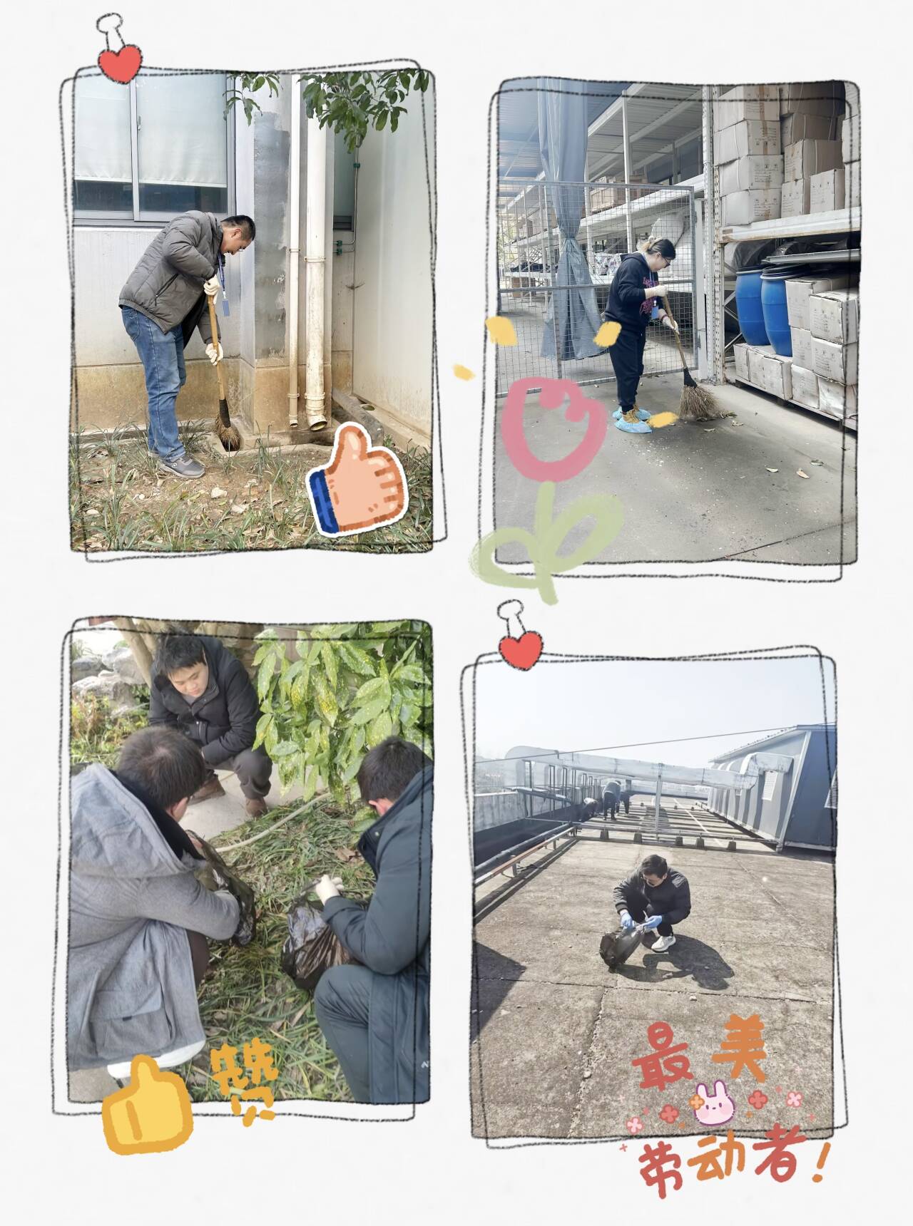 各部門同事們紛紛響應(yīng)號召,如同一股股清泉匯聚,大家秉持著不怕臟、不怕累的熱忱,以昂揚的斗志投入打掃中。看,那在樓頂清掃的同事,宛如大樓“美容師”,專注地拂去每一絲塵埃,讓樓頂在陽光的照耀下熠熠生輝;而清理倉庫周邊雜草的同事們,正在拔除歲月滋生的雜亂,為倉庫周邊重塑整潔輪廓。在這場大掃除里,每個人都是主角,齊心協(xié)力為公司區(qū)域的每一寸土地注入清新與活力。大家在共同勞作中,深切體會到維護(hù)公司公共環(huán)境的責(zé)任之重,那份強烈的責(zé)任感與使命感,如同璀璨星辰,照亮了企業(yè)環(huán)境建設(shè)的前行之路。