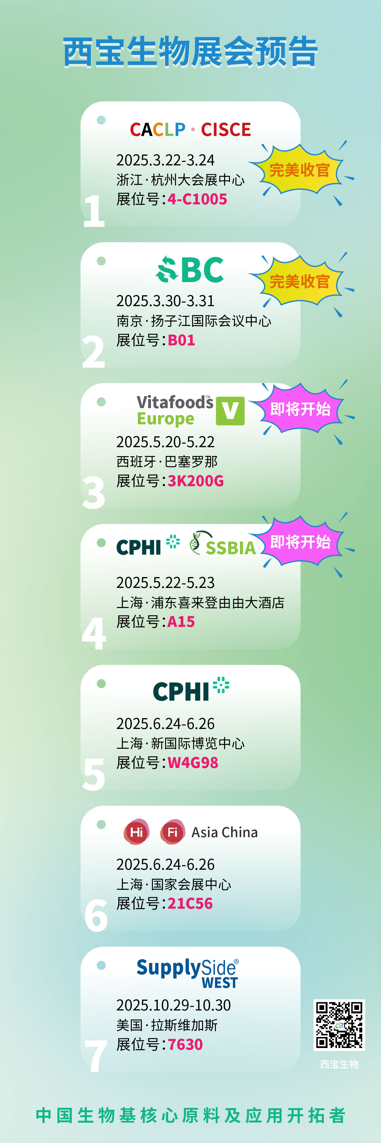 歷經(jīng)二十余載歲月沉淀,Vitafoods Europe早已蛻變成為歐洲乃至全球健康產(chǎn)品與功能食品領(lǐng)域的璀璨燈塔,是行業(yè)風(fēng)向標(biāo)的不二代表。如今,這場(chǎng)一年一度的行業(yè)盛會(huì)即將再度拉開(kāi)帷幕,又到了我們熱切期盼相聚的時(shí)刻。西寶生物,作為Vitafoods Europe連續(xù)多年的參展常客,在此滿懷熱忱,向全球客戶發(fā)出誠(chéng)摯的邀約,誠(chéng)邀您共赴西班牙巴塞羅那這場(chǎng)行業(yè)盛事。西寶生物展位號(hào)為3K200G,我們已精心籌備,只等您的大駕光臨,一同開(kāi)啟交流合作的精彩篇章。