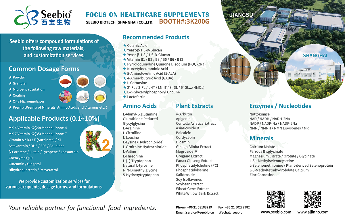 明星產(chǎn)品有維生素K2(MK4、MK7)、維生素E(succinate)/K1、維生素B12、番茄紅素、輔酶Q10、酵母β-1,3-D-葡聚糖、酵母β-1,3/1,6-D-葡聚糖、丙谷二肽、雙甘肽、地奧司明、牛至提取物、磷脂酰絲氨酸、大豆提取物、小麥胚芽提取物、納豆激酶、NMN、NR、檸檬酸鎂、乳清酸鎂、L-硒代蛋氨酸、乳清酸鉀等,期待與您的雙向奔赴!讓我們攜手共進(jìn),在這行業(yè)的大舞臺(tái)上,一同挖掘新機(jī)遇,開(kāi)拓新市場(chǎng),走向國(guó)際,創(chuàng)造新輝煌!西寶生物3K200G展位,盼您蒞臨!