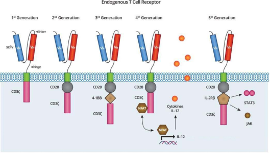 CAR結(jié)構(gòu)通常也由三部分組成,即胞外抗原結(jié)合區(qū)(一般為scFv)、跨膜結(jié)構(gòu)域以及胞內(nèi)激活結(jié)構(gòu)域。經(jīng)過(guò)多年發(fā)展,CAR結(jié)構(gòu)已經(jīng)發(fā)展至第四第五代,CAR結(jié)構(gòu)的改進(jìn)主要集中在胞內(nèi)共刺激結(jié)構(gòu)域。有學(xué)者在第四代CAR-T的設(shè)計(jì)中添加細(xì)胞因子或趨化因子受體結(jié)構(gòu),從而增加T細(xì)胞在腫瘤組織中的浸潤(rùn),達(dá)到增強(qiáng)殺傷實(shí)體瘤的效果。第五代CAR在共刺激域(如CD28或4-1BB)和CD3ζ鏈之間,插入了IL-2Rβ等細(xì)胞因子受體的胞內(nèi)片段,當(dāng)CAR結(jié)合抗原后,該片段包含的YXXQ基序(Y代表酪氨酸)招募并激活JAK激酶和STAT蛋白,從而同時(shí)啟動(dòng)T細(xì)胞活化和細(xì)胞因子驅(qū)動(dòng)的增殖信號(hào)。