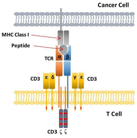 TCR-T療法依賴T細(xì)胞受體(TCR)與MHC呈遞的胞內(nèi)抗原結(jié)合識(shí)別腫瘤細(xì)胞。MHC有兩種類型MHC-I與MHC-II,由人類6號(hào)染色體短臂上的人類白細(xì)胞抗原(HLA)基因座編碼,在細(xì)胞表面不同程度表達(dá)。其中,HLA-A、HLA-B及HLA-C編碼MHC-I型分子,HLA-DR、HLA-DQ、HLA-DP編碼MHC-II型分子。MHC-I負(fù)責(zé)呈遞內(nèi)源性抗原信號(hào)分子,它在幾乎所有有核細(xì)胞表面表達(dá),由一條α鏈和β球蛋白組成,其中α1和α2兩個(gè)結(jié)構(gòu)域構(gòu)成一個(gè)溝(Groove),這是肽段結(jié)合區(qū),其允許抗原多肽片段結(jié)合并呈遞到細(xì)胞膜表面。MHC-II負(fù)責(zé)呈遞外源性信號(hào)分子,在抗原呈遞細(xì)胞(APC)表面表達(dá),如單核-巨噬細(xì)胞、樹(shù)突狀細(xì)胞及B細(xì)胞等。MHC-II由α和β兩條鏈組成,其中α1與β1之間形成的溝能參與抗原多肽片段的結(jié)合。