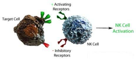 具體來(lái)講,NK細(xì)胞表面的抑制性受體(主要是抑制性殺傷性Ig樣受體KIRs和異二聚體C型凝集素受體NKG2A)可與靶細(xì)胞表面的MHC I結(jié)合并傳遞抑制信號(hào),從而使NK細(xì)胞進(jìn)入“沉默”狀態(tài);而NK細(xì)胞表面的激活性受體(主要是NCRs、NKp46、NKp30、NKp44和NKG2D)與可與細(xì)胞表面的特異性激活配體結(jié)合,從而激活NK細(xì)胞。