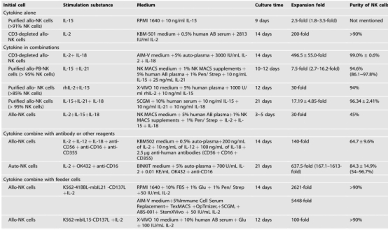 細(xì)胞因子是維持NK細(xì)胞存活和支持NK細(xì)胞體外增殖的關(guān)鍵成分,可以不需要滋養(yǎng)細(xì)胞的條件下培養(yǎng)細(xì)胞。然而,當(dāng)使用不同的細(xì)胞因子和培養(yǎng)條件時(shí),發(fā)現(xiàn)具有不同的擴(kuò)增效率。