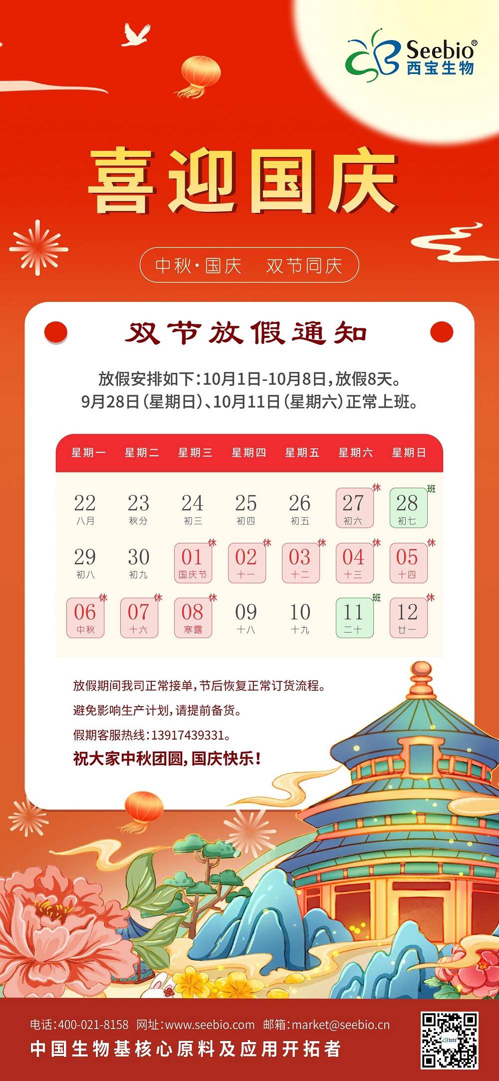 值此雙節(jié)來臨之際,西寶生物全體員工向長(zhǎng)期支持我們的合作伙伴、客戶朋友致以最誠摯的祝福!祝愿大家在這個(gè)團(tuán)圓的節(jié)日里,闔家幸福、萬事順意,度過一個(gè)輕松愉悅的假期!節(jié)后我們將以更飽滿的熱情、更專業(yè)的服務(wù),與您繼續(xù)攜手前行,共創(chuàng)美好未來!