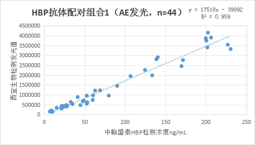 西寶生物發(fā)光(AE)平臺(tái)HBP抗體配對(duì)組合1與中翰盛泰HBP試劑(熒光免疫層析)賦值的臨床樣本相關(guān)性R2在0.95左右,相關(guān)性較好。
