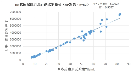 西寶生物發(fā)光(AP)平臺(tái)TM抗體配對(duì)組合4(三試劑模式)與希森美康 TM試劑(化學(xué)發(fā)光法)賦值的臨床樣本相關(guān)性R2>0.95,相關(guān)性良好。