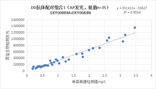 西寶DD抗體配對(duì)組合1(<4mg/L)的發(fā)光值與希森美康DD試劑臨床相關(guān)性R2在0.95左右;