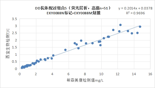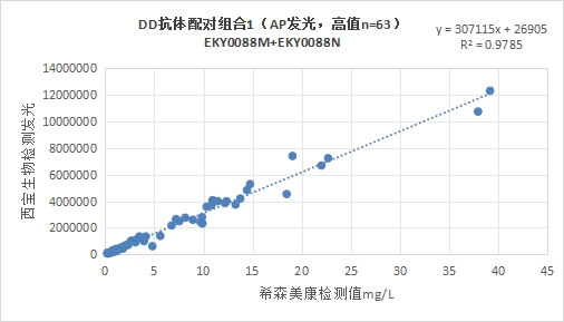 西寶DD抗體配對(duì)組合5(<15mg/L)的發(fā)光值與希森美康DD試劑臨床相關(guān)性R2>0.95。