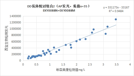 西寶DD抗體配對(duì)組合3(<4mg/L)的發(fā)光值與希森美康DD試劑臨床相關(guān)性R2>0.95;