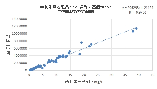 西寶DD抗體配對(duì)組合2(<40mg/L)的發(fā)光值與希森美康DD試劑臨床相關(guān)性R2大于0.95。