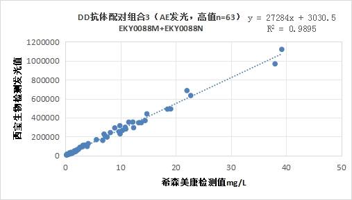 西寶DD抗體配對(duì)組合3(<40mg/L)的發(fā)光值與希森美康DD試劑臨床相關(guān)性R2>0.95。