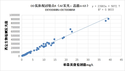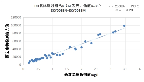 西寶DD抗體配對(duì)組合4(<4mg/L)的發(fā)光值與希森美康DD試劑臨床相關(guān)性R2在0.95左右;