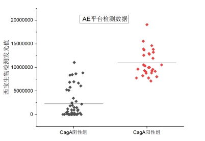 圖1為AE平臺(tái)檢測(cè)臨床樣本發(fā)光值分布,CagA陰性組發(fā)光值均值與CagA陽(yáng)性組發(fā)光值均值能夠明顯區(qū)分。由表1數(shù)據(jù)可得,3例假陽(yáng)性樣本及5例假陰樣本均落在參考系統(tǒng)的cutoff附近,屬于灰區(qū),需要用第三方試劑進(jìn)行確認(rèn)。西寶生物AE組合與參考系統(tǒng)的靈敏度大于80%,特異性及符合率大于90%,說(shuō)明兩種試劑的臨床符合率較高。