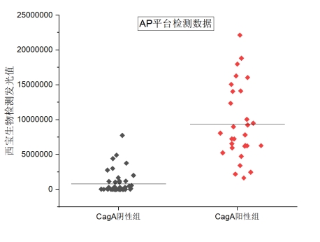 圖2為AP平臺(tái)檢測(cè)臨床樣本發(fā)光值分布,CagA陰性組發(fā)光值均值與CagA陽(yáng)性組發(fā)光值均值能夠明顯區(qū)分。由表2數(shù)據(jù)可得,3例假陽(yáng)性樣本及4例假陰樣本均落在參考系統(tǒng)的cutoff附近,屬于灰區(qū),需要用第三方試劑進(jìn)行確認(rèn)。西寶生物AP組合與參考系統(tǒng)的靈敏度大于85%,特異性及符合率大于90%,說(shuō)明兩種試劑的臨床符合率較高。